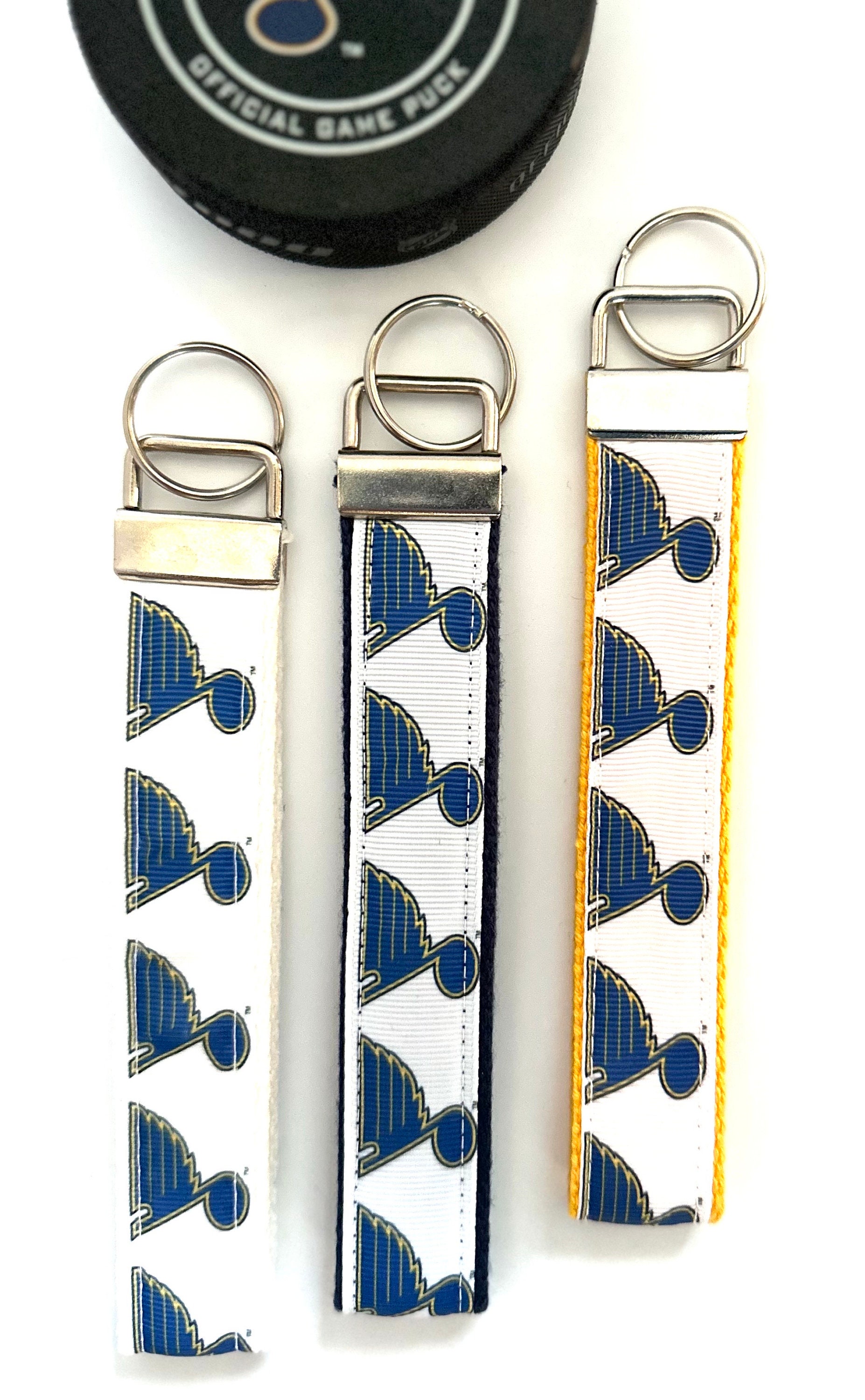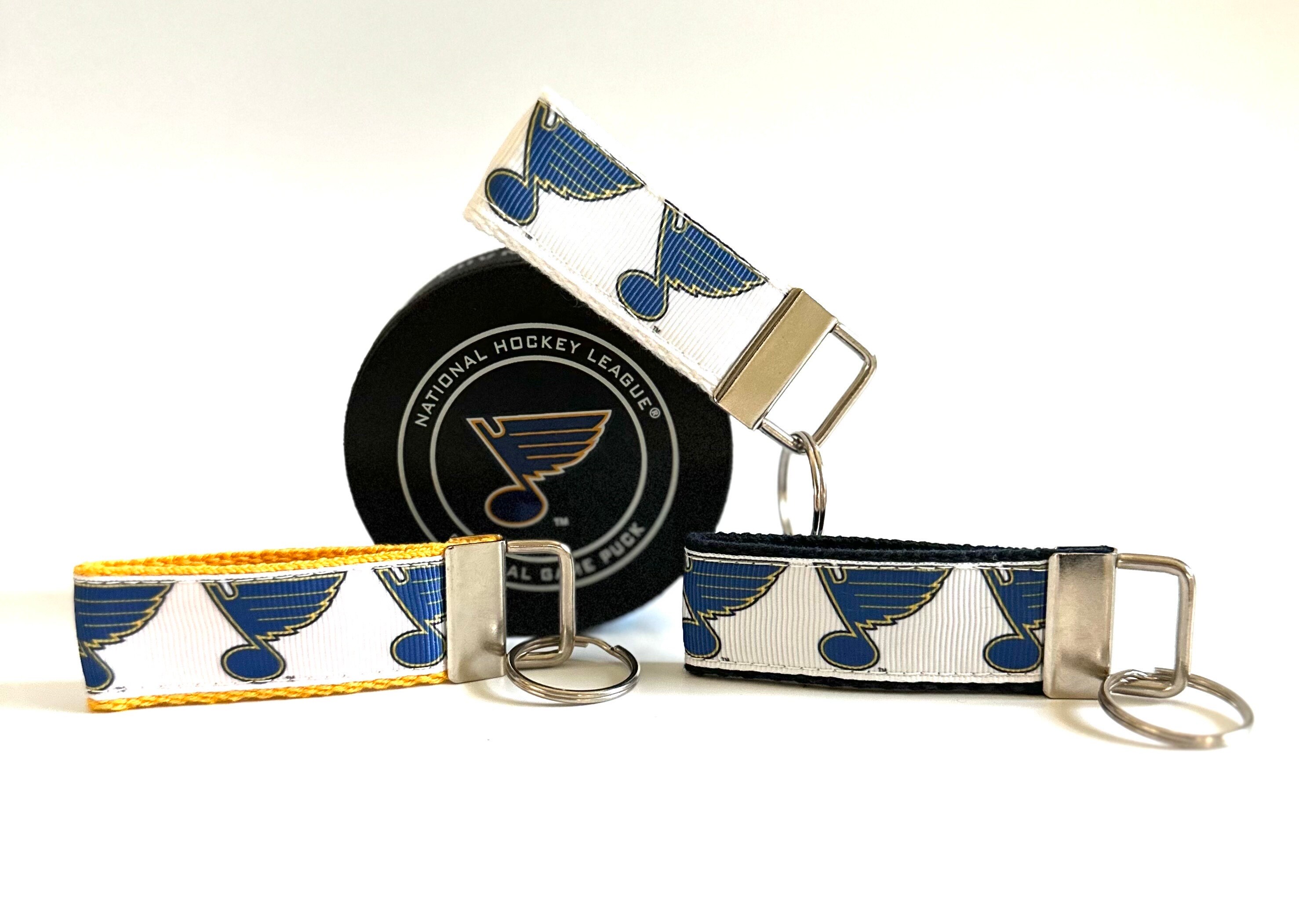 This Key Chain is made with St. Louis Blues music note grosgrain ribbon and heavy-duty cotton webbing in the color of your choice. The hardware clip is nickel plated and comes included with key ring.