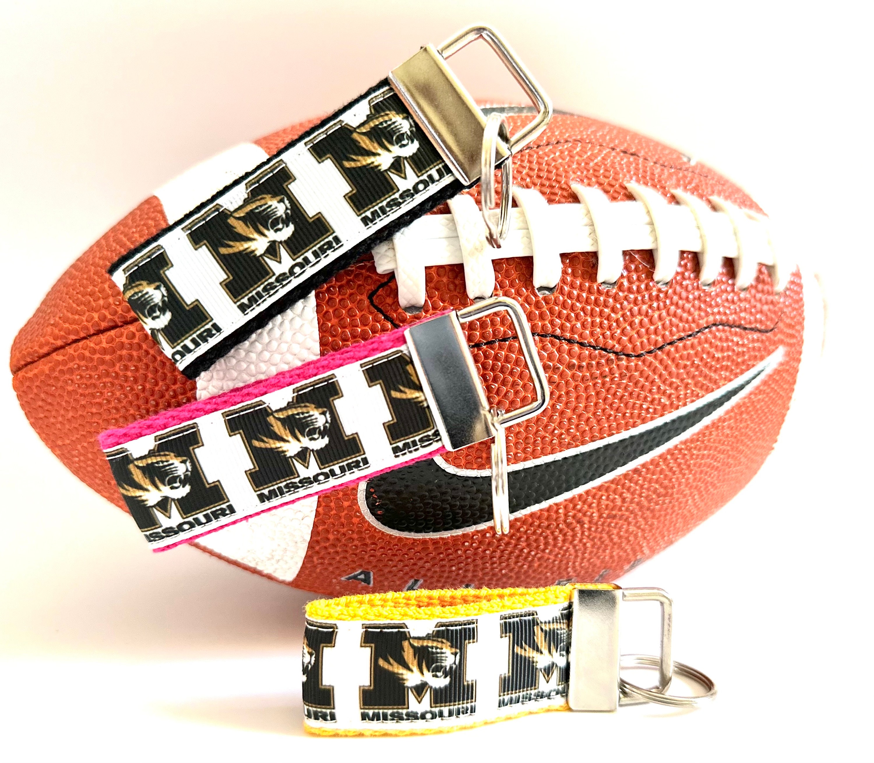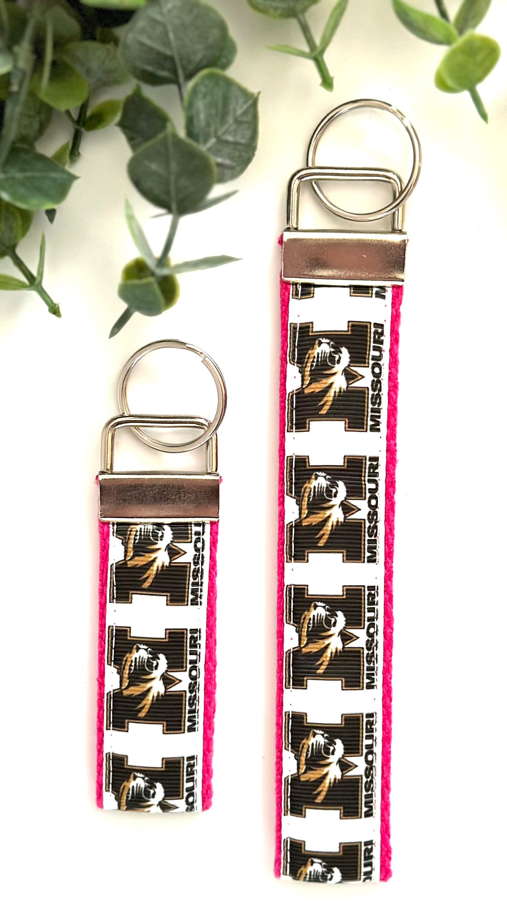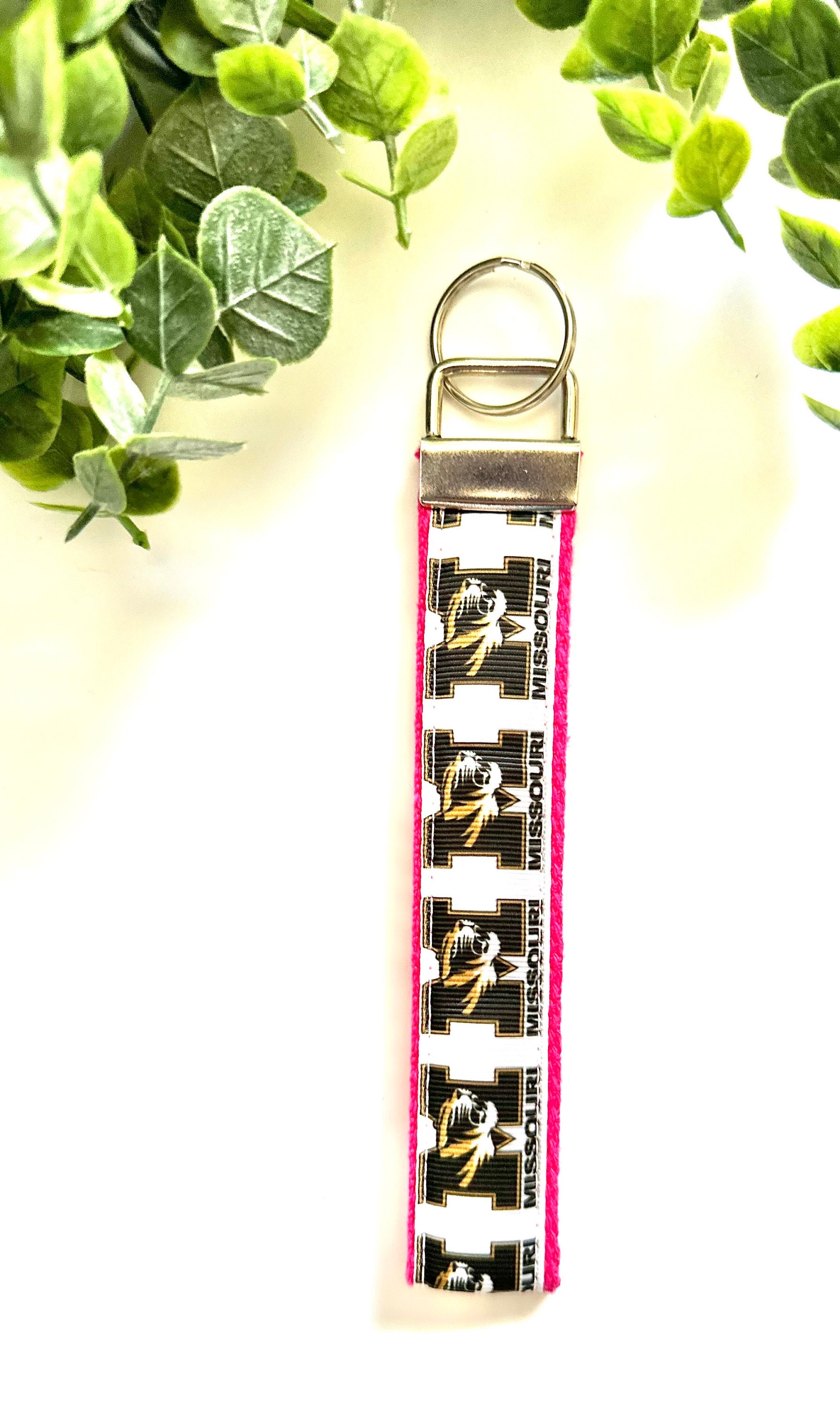 This glamorous key fob, fabric key chain, keys wristlet is just what you need to keep your keys handy while looking stylish and representing the Mizzou Tigers!